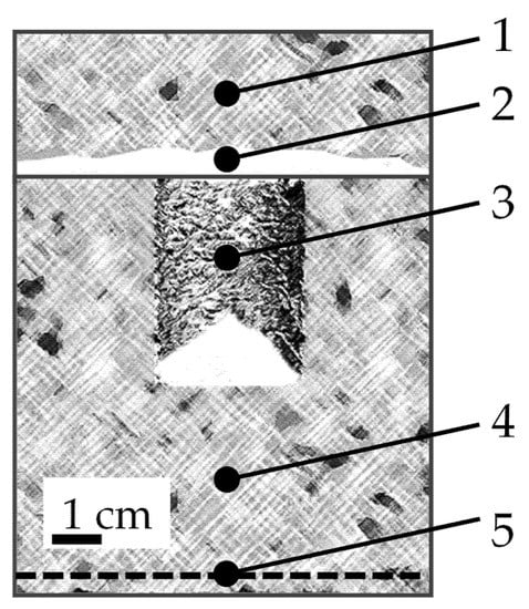 The crucible method (ASTM C 454-83:2007) was chosen to assess the influence of alkali attack on the structure of the castable []. For the tests, 70 × 70 × 70 mm castable specimens with a cylinder-shaped cavity of a diameter of 20 mm and a height of 30 mm (4 specimens for a series of castable) were made. The specimens were dried at the temperature of 110°C and fired at the temperature of 1100 °C. After adding 9 g K2CO3 into the cylinder-shaped cavity, the specimens were fired at the temperature of 1100 °C for 5 h. The cavity was covered with another specimen (70 × 70 × 20 mm). After multiple tests (upon adding 9 g K2CO3 for each test), the specimens were inspected visually and an appearance of microcracks in them was registered. For SEM/EDS analysis of the affected zones of the castable, a specimen of a composition identical to the specimen used for covering the cavity of the specimen was used (Figure 2, point 2). After three cycles of the test, a specimen was cut out from the said specimen; the surface of the latter was strengthened by resin and then smoothed and polished. For X-ray and mercury intrusion porosity after 3 alkali resistance cycle tests, the samples were cut from the same point 2 area (Figure 2).