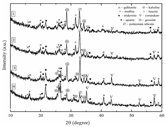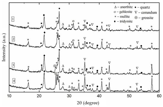 X-ray diffraction patterns of castables after thermal treatment at the temperature of 1100 °C: 1—CC-1; 2—CC-2; 3—MCC-1; 4—MCC-2.