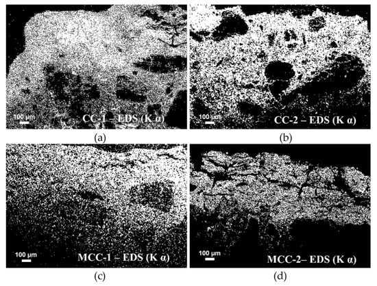 The concentration of potassium is high in the surface layer of the specimen, where the protective layer has formed, with a clear decrease in the zone below (this is particularly evident in the case of the MCC-2 in Figure 5d). The formation of microcracks and low penetration of K into the aggregate particles can be observed in the protective layer of the MCC.