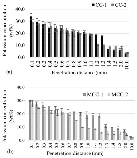 Potassium distribution in the surface layer of castable: (a)—CC; (b)—MCC.