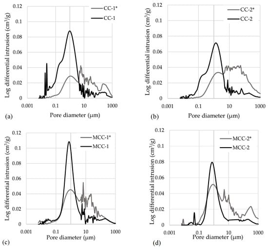 Result of castable porosity before and after 3 cycles of alkaline attack (*): (a)—CC-1; (b)—CC-2; (c)—MCC-1; (d)—MCC-2.