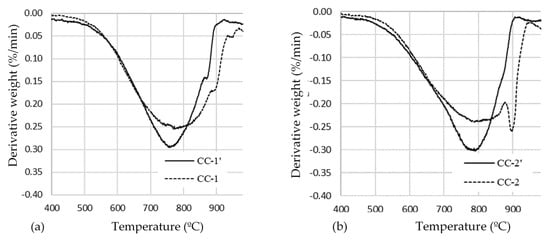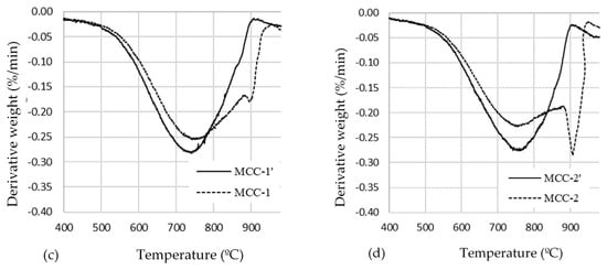 DTG curves of K2CO3 and castable powder mixtures: (a) a mix without GQS CC-1′ and with GQS CC-1; (b) a mix without GQS CC-2′ and with GQS CC-2; (c) a mix without GQS MCC-1′ and with GQS MCC-1; (d) a mix without GQS MCC-2′ and with GQS MCC-2.
