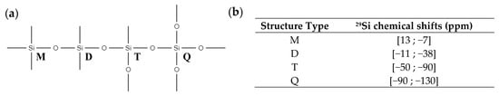 (a) Possible structures of silicon atoms in polysiloxanes and (b) corresponding chemical shifts of silicon atoms of a polysiloxane chain, depending on the silicon functionality, in 29Si NMR spectroscopy [25]. Chemical shifts are expressed in parts per million (ppm) and correspond to the relative difference in resonance frequency between the silicon atoms of the sample and tetramethylsilane (TMS).