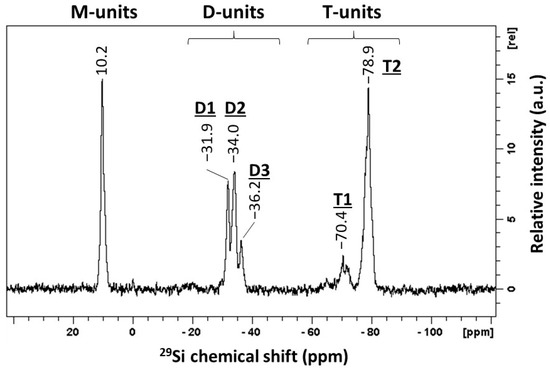 The quantitative 29Si NMR analysis of the Silres H62C showed the presence of mono-functional (M units, 21.9%), di-functional (D units, 31.4%) and tri-functional (T units, 46.7%) silicon atoms (Figure 2). Interestingly, no Q unit was observed. Although the large proportions of D and M units are usually characteristics of a relatively linear polymer, the preponderance of T units showed that the H62C was also significantly branched. A unique population of mono-functional silicon atoms was observed at 10.2 ppm, indicating that the M units of the Silres H62C all showed the same structure. On the other hand, three distinct populations of D unit signals were observed at −31.9 ppm (D1), −34.0 ppm (D2) and −36.2 ppm (D3), respectively (Figure 2). According to the literature [25], the three populations could be attributed to di-functional Si atoms bound to the methyl and hydrogen groups, as they are all located around −35 ppm. Regarding the T units, the main signal centered at −78.9 ppm (T2) could be attributed to tri-functional Si atoms bound to the phenyl groups [25]. A second minority population of T units, representing 19.7% of the total T units, with a complex signal positioned between −63 and −73 ppm, was also observed (T1) and could correspond to Si atoms bound to non-aromatic substituents.