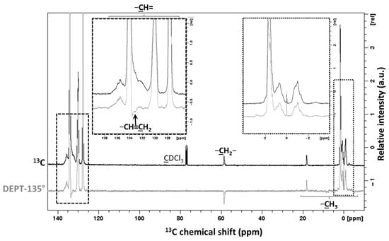 Direct 13C NMR (black) and DEPT-135 (grey) experiment measuring Silres H62C polysiloxane at 2 g·mL−1 in CDCl3, with a relaxation time of 2 s and from 1024 successive scans.