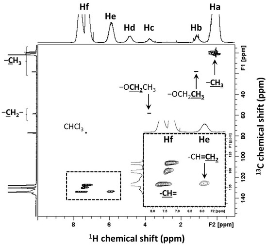 The direct 13C and DEPT-135 (Figure 4) and HSQC 1H-13C experiments (Figure 5) were performed to study further the attribution of the different functional groups of polysiloxane. Three domains were observed on the 13C NMR spectrum. The first domain, between 125 and 138 ppm, corresponded to the sp2 carbons. The peaks centered at 127.6, 130.0 and 134.0 ppm, respectively, which are positive in the DEPT-135, match with carbons having a double bond and linked to a single hydrogen atom (-CH=). These peaks were attributed to the carbons belonging to the aromatic (127.6 and 130 ppm) and vinyl groups (-CH=CH2, 134 ppm), respectively. The HSQC experiment showed a clear correlation between the aromatic protons (Hf) and aromatic carbons at 127.6 and 130 ppm (Figure 5), in good agreement with this attribution. On the other hand, the carbon signal at 134 ppm and attributed to the -CH= of vinyl groups was also correlated to the Hf signal (Figure 5). Therefore, the Hf signal was supposed to be a superposition of the signals from the aromatic and vinyl protons and could not be used to directly quantify the phenyl groups in the Silres H62C polysiloxane. Interestingly, the DEPT-135 experiment also showed the presence of a =CH2 groups in the first domain (125–138 ppm, Figure 4). This negative peak, centered at 133.6 ppm, was attributed to the second carbon of the vinyl groups (-CH=CH2). Based on the corresponding correlation in the HSQC experiment (Figure 5), the He signal, centered at 5.9 ppm on the 1H spectrum and representing 7.2% of the total proton amount, was then attributed to the =CH2 protons of the vinyl groups. Consequently, the –CH= protons of the vinyl and aromatic groups, both superposed in the Hf signal, were estimated to represent 3.6 and 33.6% of the material protons, respectively.