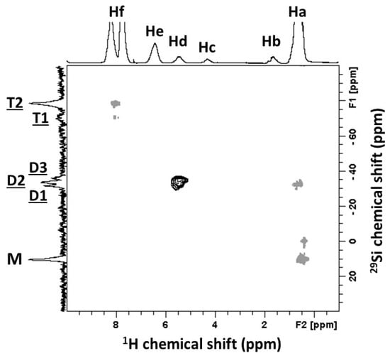 The HSQC 1H-29Si experiments were also performed to determine the first order coupling (1J) correlations between the protons and silicon atoms (Figure 6). Such correlations usually allow the identification of only the silyl (Si-H) positions on a polysiloxane chain. Very interestingly, a unique correlation was observed between the unattributed Hd signal (4.8 ppm) and the peaks corresponding to the di-functional silicon atoms (D, [−36.2; −31.9 ppm]), indicating that the silyl groups are only carried by Si atoms in the D configuration. Clearly, this observation also helped us to attribute the Hd signal to the silyl protons and to understand the absence of correlation between the Hd signal and carbon atoms (Figure 5). The HMBC 1H-29Si experiments allow the characterization of the long-range correlation signals between protons and silicon atoms (from 2J to 4J, i.e., separated by two to four bonds), by suppressing the first-order correlation signals (1J observed in HSQC). This NMR technic was also used to characterize the Silres H62C polysiloxane (Figure 6). First, a clear correlation between the methyl proton signal (Ha, 0.1 ppm) and the mono-functional Si units (M, 10.2 ppm) was observed. Interestingly, no other correlation was observed with the M units, indicating that the polymer chain-ends are exclusively the trimethyl silane groups. On the other hand, the methyl protons (Ha) were also correlated to the di-functional Si units (D, [−36.2; −31.9 ppm]) but not to the tri-functional ones (T, [−78.9; −70.4 ppm]). Therefore, the methyl groups can only be found on the M and D siloxane units. Concerning the Si T units, two long-range correlations were only observed with the Hf protons (7.4 ppm). With the Hf signal being a superposition of the aromatic and vinyl protons (–CH=), it explains the presence of two Si T units: the main T signal positioned at −78.9 ppm (T2, 80.3% of the T units) corresponds to the Si atoms carrying a phenyl group in accordance with the literature [29], whereas the other T signal at −70.4 ppm (T1, 19.7%) could correspond to the Si atoms carrying a vinyl group. Lastly, no 1H-29Si correlation was measured, neither with the HSQC nor HMBC sequences, for the Hb and Hc signals, confirming the respective attributions to the methyl and methylene protons of ethoxy groups. Indeed, intermediary oxygen atoms do not allow long-range correlation. Consequently, the NMR methodology used was sufficient to establish the presence of the ethoxy groups but not enough to identify their position on the polysiloxane chains at this point. Therefore, the ethoxy groups could be either on the D or T units.