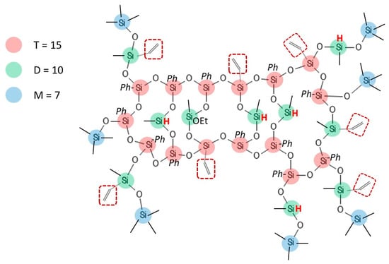 Finally, after quantifying and positioning all of the functional groups present in the H62C polysiloxane, an example of the chemical structure was proposed for the polymer (Figure 7). Indeed, the proportions of Si atoms in the polymer (M: 21.9%, D: 31.4%, T: 46.7%), gave us a minimal atomic ratio of 7:10:15 (M:D:T) between the Si atoms. This ratio was found to be composed of minimal whole numbers, allowing the polymer to be liquid at room temperature. Obviously, this calculated structure (1207 g·mol−1) was based on a unique chemical structure, but a mix of several lighter polysiloxane structure could also be considered. Nevertheless, the 7:10:15 ratio indicated that the polymer probably has a branched ladder-like structure.