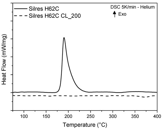 DSC analyses were carried out to investigate the cross-linking of the Silres H62C compound (Figure 8). The polysiloxane was used as received and after cross-linking at 200 °C for 1 h in air (CL_200). First, the DSC thermogram of the raw Silres H62C polymer showed a cross-linking peak spread between 171 and 242 °C, with an onset at 183 °C with a maximum centered at 190 °C and an enthalpy of cross-linking calculated to be 71.4 J·g−1. After a thermal treatment at 200 °C, the subsequent DSC analysis of the cured polysiloxane remained flat, indicating that cross-linking was complete at this temperature.