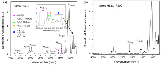 The structural evolution of Silres H62C during cross-linking was followed by FT-IR analyses (Figure 9). The assignment of each band is listed in Table 4. From the raw polysiloxane analysis (Figure 9a), a broad absorption band, between 990 and 1200 cm−1, was related to the siloxane structure and corresponded to the various vibration modes of the Si-O bonds [30]. In particular, the very intense absorption band at 1053 cm−1 was attributed to the asymmetric vibration of the Si-O bonds. On the other hand, the second band at 1134 cm−1 indicates a branched polysiloxane structure with T units [30], in agreement with the NMR analyses.