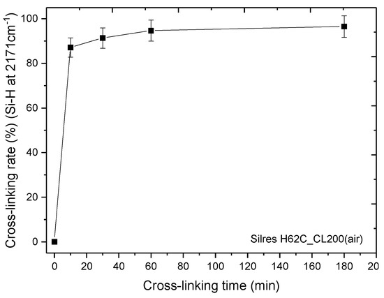 The evolution of the vibrational band of the silyl groups (2171 cm−1) was then used to follow the cross-linking rate, as a function of the cross-linking time, at 200 °C in air (Figure 10). A fast consumption of the silyl functions was measured during the first minutes at 200 °C, with a consumption rate of 87% after only 10 min. After that, the cross-linking kinetics tended to decrease drastically to reach a consumption rate of 96.5% after 3 h. Then, a longer cross-linking time at 200 °C did not lead to a significant improvement in the cross-linking rate, probably due to a lack of mobility of the reactive species in the cross-linked material. In fact, the Silres H62C resin contains a couple of platinum catalysts/inhibitors. The rapid thermal degradation of the inhibitor at 200 °C quickly triggers the catalysis of the cross-linking reaction. The catalyst then generates radicals that accelerate thermal cross-linking by hydrosilylation. A sufficient mobility of these radicals is important to cross-link the resin. When the cross-link density is too high, the mobility of the reactive species decreases, which highly slows down the reaction kinetic. Considering these results, a thermal treatment of 1 h at 200 °C in air was fixed for the following investigations. The polymer cross-linked under these conditions appeared translucent and rigid, and the cross-linking rate measured using FT-IR spectroscopy was 94.6%.