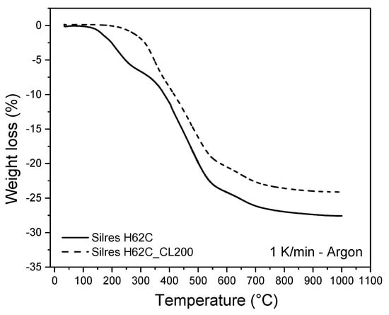 TGA analyses of starting and cross-linked Silres H62C. TGA was performed at 1 K/min up to 1000 °C for 1 h in argon.