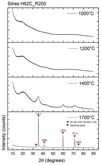 XRD characterizations were performed on the Silres H62C resin cross-linked at 200 °C in air and pyrolyzed in argon at temperatures between 1000 and 1700 °C (Figure 12). For the pyrolysis temperatures of 1000 and 1200 °C, the obtained materials exhibited a diffractogram typical of an amorphous material, with a broad hump around centered around 2θ = 20°, associated with the amorphous Si-O bonds. A signal with a broad peak width for Silres H62C treated at 1400 °C was then observed, indicating the progressive apparition of a crystalline phase between 1200 and 1400 °C. Five distinct and fine peaks were finally observed for 35.6, 41.3, 59.9, 71.7 and 75.4° on the diffractogram of the materials pyrolyzed at 1700 °C. All diffraction peaks were associated with the cubic silicon carbide (3C-SiC) crystalline phase. The crystallite size calculated from the Scherrer equation using the (111) peak was 73 nm at 1700 °C.