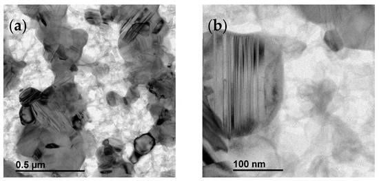 Finally, an observation using transmission electron microscopy of the ceramic converted at 1700 °C reported in a previous work [21] confirmed the presence of the SiC crystalline phase and residual carbon-rich phase (Figure 13). The final composition of the ceramic obtained from the conversion of the Silres H62C polysiloxane resin at 1700 °C in argon gave a solid compound made of 82.15 wt% SiC, 0.69 wt% SiO2 and 17.16 wt% of free C. The results obtained using the Scherrer equation from XRD give smaller-sized particles than the observation using TEM which shows an average particle size of 122 nm, accessed by image analysis. The discrimination of the particles using image analysis is made difficult by the superposition of particles and the presence of numerous twins.
