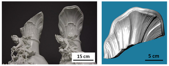 After glazing the fragments at 1250 °C with a transparent glossy glaze, the surface became very smooth and gave the part the typical appearance of Meissner porcelain, which is shown in Figure 19.