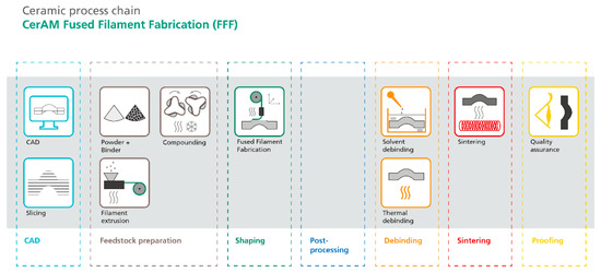 To investigate the systematic appearance of distortion, it is evident that simple geometries must be manufactured to derive the main effects of the applied processing. Therefore, simple box squares were manufactured and processed prior to the manufacturing of the complex fragments (Figure 1). The filament was produced at Fraunhofer IKTS, utilizing a kneader and twin-screw extrusion and followed by the spooling procedure. The filament was processed in a slightly modified FFF Prusa i3 MK3 S+ (Prusa Research, Prague, Czech Republic) printer using an ordinary brass nozzle. The modification of the printer included the cooling of the filament prior to being extruded to avoid softening during the filament conveying process towards the hot nozzle. The early softening can cause blocking for ceramic filaments due to their low melting point compared to thermoplastic filaments such as PLA, ABS, etc. The wet milled and dried porcelain powder was supplied by KI Keramik-Institut GmbH Meissen, Germany, based on the traditional porcelain recipe with a d50 of 1.65 µm. The thermoplastic non-commercial polyamide-like binder system was provided by Inmatec Technologies GmbH, Reihnbach, Germany. To investigate the porosity, the Archimedes Method was used, in which the samples were immersed in distilled water. An overview of the process chain is given in Figure 2.