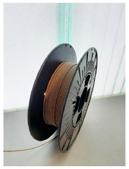 The produced homogeneous filament (Figure 5) exhibits superior flexibility compared to other ceramic filaments on the market and, at the same time, possesses rigid properties to be processed at standard printers. The bending radius of the filament was ~10 mm before breaking. The reached diameter of the filament was 1.76 mm (±0.02 mm) and fulfils all requirements for good green part manufacturing. The layers are very fine and smooth, as seen in Figure 5.