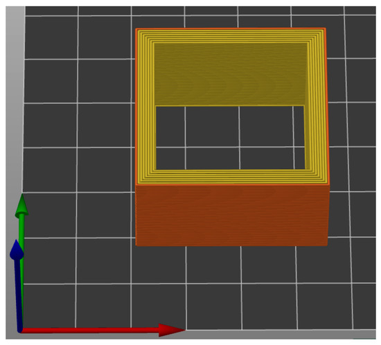 For the animation of the G-code, the PrusaSlicer G-code Viewer- 2.5.0 (Prusa Research, Prague, Czech Republic) was utilized. In order to investigate the distortion, the square box green parts consisting of eight parallel lines (Figure 6) were 3D measured after solvent debinding and sintering. Thereafter, the manufacturing directions: clockwise, counterclockwise and alternating (n = 2) were investigated.