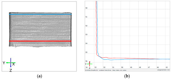 GOM measurement of square 1; (a): two investigated planes (blue and red); (b): superimposed planes from top view; manufacturing direction: clockwise; solvent debinded.