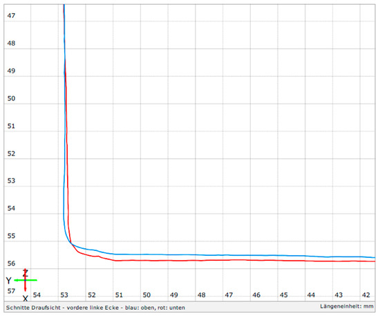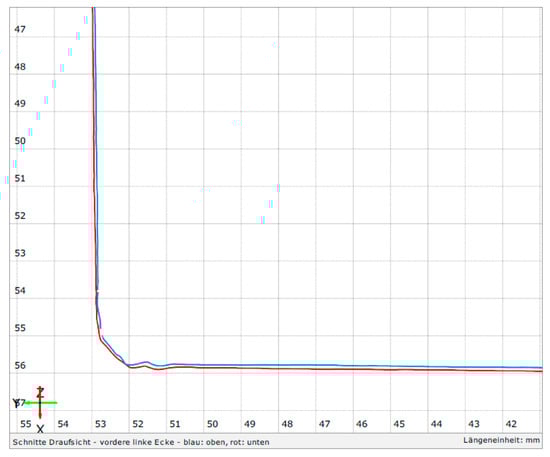 It turned out that the blue and red contour are not congruent in top view, which indicates a twisting of the structure during solvent debinding. The deformation takes place counterclockwise, if the bottom line (red) is assumed to be the fixed base line. If the manufacturing direction is counterclockwise, the deformation is clockwise, as shown in Figure 8. The deformations can be seen with the naked eye. An impressive picture is revealed when looking at Figure 9. No significant deformation is detected in this case. It is assumed that the stresses leading to deformation, while manufacturing in the same direction is compensated by such a change in direction. The deformation was not found in the green state, which led to the assumption that a softening took place during the solvent debinding, releasing stresses by increasing the deformation.