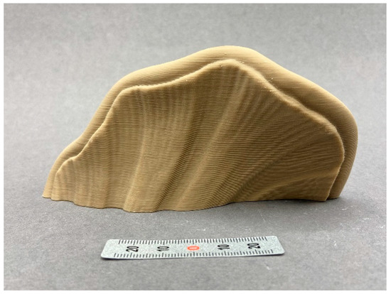 After sintering the clockwise manufactured part, shown in Figure 16, cracks occurred which were inter- and intra-laminar. The deformation is expectedly very high. In addition, the twisting of the baseplate (z = 0) is now clearly visible. The crack formation is caused by critical stresses during processing. The process step in which the cracks occurred is unknown, however, as the stresses and strength of the component vary in the certain processes (during solvent debinding, during thermal debinding, during sintering). In particular, during solvent debinding where the component swells [15], cracks close after drying due to the contraction of the component. Therefore, they are difficult to observe, however, they are present. They can be reopened during thermal debinding or during sintering. By applying an alternating layer deposition with n = 2, a completely different distortion behavior occurs. The sintered fragments exhibit a comparatively low-level distortion, of up to 1 mm, compared to the CAD-model, which is shown in Figure 17. The twisting of the baseplate is no longer visible. Despite the fact that the distortion could not be fully prevented, the influence of the alternating printing strategy is very significant.