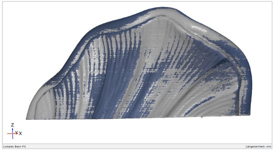 After sintering the samples, the same qualitative appearance of distortion, with no significant change, was observed. The twisted samples remained twisted, the alternating one stayed accurate. It is assumed that, with this observation, larger parts such as the fragments could be manufactured with less distortion, necessary for form-fitting to the fracture surface of the splendid vase. Therefore, the G-codes of the fragment was post-processed with n = 2. An animated G-code of a cut fragment is shown in Figure 10. Figure 11 shows a green part without the bottom fracture surface. To investigate the distortion of the fragment, a comparison between the CAD-model and the green state printed clockwise (fragment 1) or alternating with n = 2 (fragment 3), as well as the corresponding solvent debinded and sintered component to the CAD-Model, was made. To scan the manufactured component in each state, the computer tomograph CT compact was utilized. A superimposed visualization of the CAD-Model (blue) and the green part (gray) is illustrated in Figure 12. The penetrating colors show slight deviations of the manufactured part from the CAD-model. To quantify the deviations, the normalized distance (best fit) of discrete points are illustrated in Figure 13. The green color indicates a good conformity in the chosen value range of ±4.5 mm.