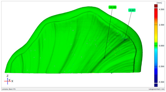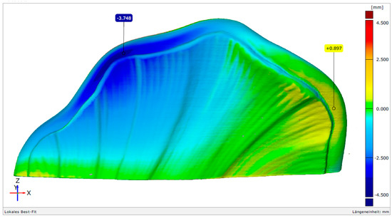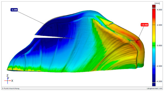 After solvent debinding, a completely different deformation occurred, as suspected, following the observations of the squares above. The weight loss after solvent debinding was calculated to 18 wt.-%. This corresponds to ~71% of the total amount of binder in the filament. The best-fit deviations of the clockwise-manufactured component, compared to the CAD-model, grew drastically, up to ± 4.5 mm, as shown in Figure 14. In the lower left corner of the component, a twisting of the baseplate can be observed (yellow to blue = sign change), which leads to the fact that such a fragment would not be able to accurately reproduce the fracture surface.