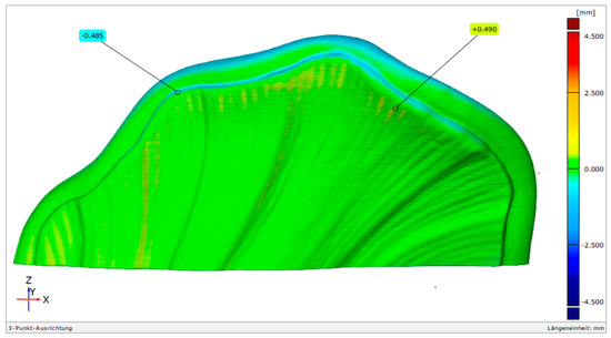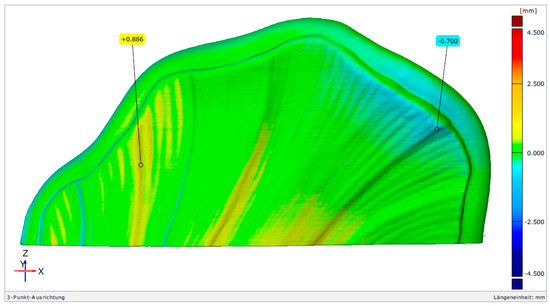 A different picture was shown when the alternated manufactured part was investigated, as shown in Figure 15. The maximum deviation is approximately ± 1 mm. This confirms the effect of the change in manufacturing direction and the relaxation during the solvent debinding in acetone. Although the mode of deformation is not a classical twisting, such as that observed during the investigation of the squares, the qualitative distortion is systematic when comparing several parts.