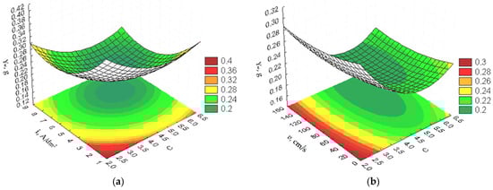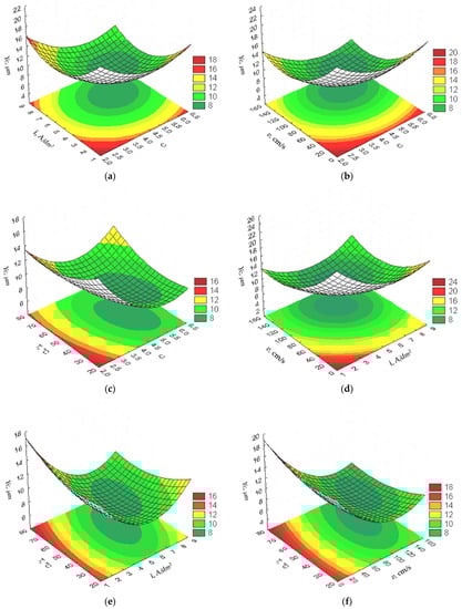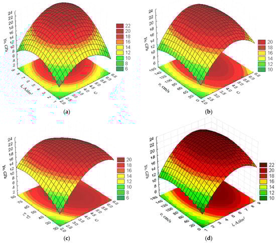 The significance of the obtained coefficients of the regression equations was checked by Student’s t-test. The coefficient was considered statistically significant under the condition that , where the t-test, selected from the reference table for the significance level of 0.05 and degrees of freedom —coefficient error (here, is considered ). Statistically insignificant coefficients were discarded and regression equations were refined. The resulting regression equations were tested for adequacy using Fisher’s F-test.