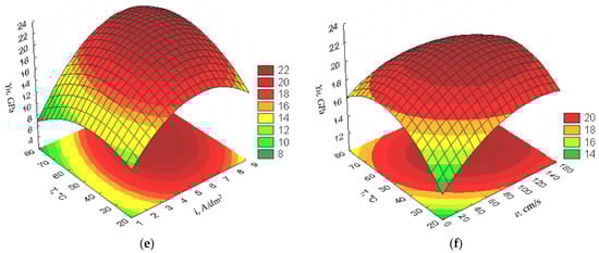 To analyze the influence of the technological parameters of the PEO process in the flow electrolyte (variable factors) on the optimization parameters, response surfaces and their two-dimensional sections were constructed depending on two variable factors (the other two factors were at a constant basic level) (Figure 2, Figure 3 and Figure 4).