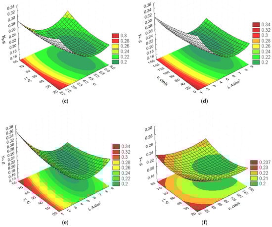 Response surfaces of dependence of the wear coating on the technological parameters of the PEO process in the flowing electrolyte: (a)—C, i, v = 75 cm/s, T = 50 °C; (b)—C, v, i = 5 A/dm2, T = 50 °C; (c)—C, T, i = 5 A/dm2, v = 75 cm/s; (d)—i, v, C = 4.4, T = 50 °C; (e)—i, T, C = 4.4, v = 75 cm/s; (f)—v, T, C = 4.4, i = 5 A/dm2.