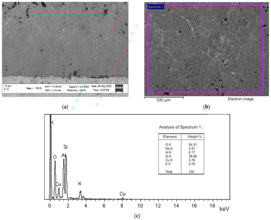 SEM micrograph of the interface between the PEO coating and the base alloy D16T (a) and the EDS analysis of the PEO coating: (b)—area of EDS analysis; (c)—resulting spectrum and chemical composition at the analyzed area.