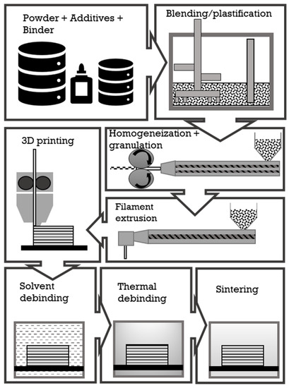 However, in contrast to CIM, the green-body property of the filament in FDC plays a crucial role in the reliability of the process. Brittle filaments are constraining as they require modified printers or manual feeding [16,17]. Filament rupture may not only cause a loss of time but also irregular extrusion rates and irregular cooling if the printing process needs to be stopped. Therefore, not only the properties of the sintered parts but also the mechanical properties of the filament should be considered for improving the material and process.