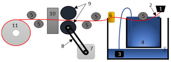 Schematic representation of the filament pulling machine. 1: nozzle of the single-screw extruder, 2: filament, 3: water pump, 4: water container, 5: guide wheel, 6: sponge, 7: stepper motor, 8: timing belt transmission, 9: PU rubber conveyor wheel, 10: laser measuring head, 11: filament spool.