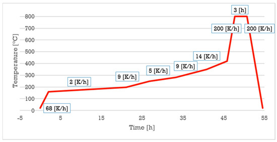 In the first solvent debinding step, the parts were dipped into acetone at 40 °C for at least 12 h until the mass loss reached at least 6 wt.% to create an open porosity for the thermal debinding. The second debinding step is based on a temperature program presented in the work of Sommer [18] and can be seen in Figure 3.