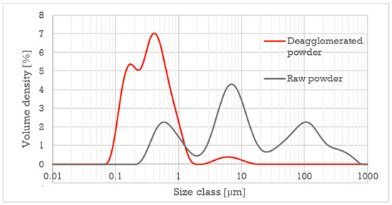 In one of the filament compositions (cf. Section 2.2 below), Dolapix CE 64 (Zschimmer and Schwarz GmbH and Co. KG, Lahnstein, Germany), a dispersing additive was added. This suspension was deagglomerated with 2 mm alumina beads in a rotating container for 10 h. Particle size distribution (PSD) was measured using a laser granulometer Mastersizer 3000 with the Hydro LV wet sample dispersion unit (Malvern Panalytical, Malvern, UK). The raw and the deagglomerated ceramic powders were dispersed in distilled water and added into the water-based measuring cell until the obscuration level reached approximately 15%. The assumed refractive index for particle size calculations according to the Mie model was 1.76 for Al2O3.