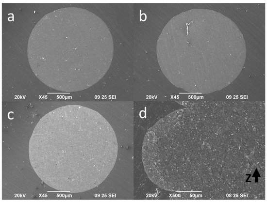 SEM micrographs of the ground cross-sections of the V1 filament (a), V2 filament (b), V3 filament (c) at mag. ×45, and V3 printed cubic sample (d) at mag. ×500, Z: vertical printing direction.