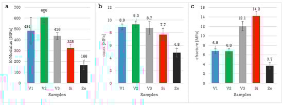 Young’s moduli (a), ultimate tensile strength (b), elongation at break (c) of the V1, V2, V3, Si (SiCeram), Ze (Zetamix) printed green-body tensile specimens.