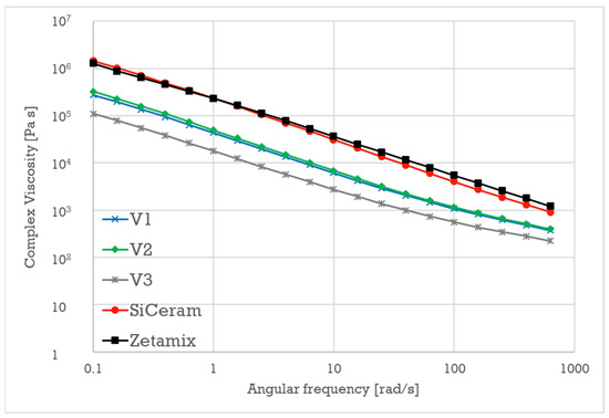 Complex viscosity of the V1, V2, V3, SiCeram and Zetamix filaments at 145 °C.