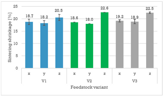 The sintering shrinkage was measured on three cubic samples for each feedstock’s variant with a green-body edge length of 15 mm, except for the V2 samples, where it could only be measured on one sample because of the delamination during the debinding of the two other samples. The measurements were taken in the middle line of the sides with an Orion electronic caliper (HAHN+KOLB Werkzeuge GmbH, Ludwigsburg, Germany). Each printing direction was considered. The sintering shrinkage, given in percentage (%), was calculated as follow