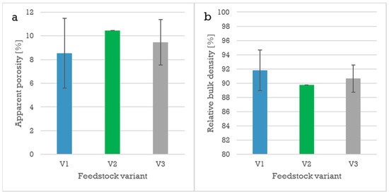 After sintering, the mean bulk density and the apparent porosity of the V1 indicated Figure 10 was slightly higher, but the standard deviations of the measurements were consequent. The 10% relative bulk density missing was consistent with the apparent porosity values, which meant that most of the porosity came from open pores. This open porosity, which was situated between the extruded layers and exhibited the classical triangle shape for the FFF process, could be seen in micrographs not displayed in this paper. The microstructure of the extruded and sintered strands was dense (cf. below Figure 12 of the V3 sample).