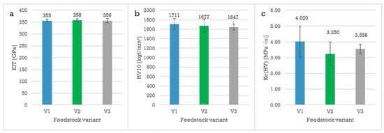 Despite the high open porosity due to printing defects that makes V1, V2, and V3 samples not representative for structural parts, the Young’s modulus derived from the indentation modulus, the Vickers’s hardness and the fracture toughness, displayed in Figure 11, show expected values for alumina. The indentation modulus and Vickers hardness can be considered identical for the three variants. The fracture toughness determined by indentation presents values between 3 MPa√m and 4 MPa√m, which are attributable to the bulk material, since the indentations were made relatively far away for the macro-pores.