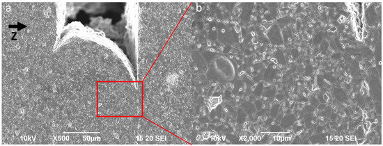 SEM micrographs of the cross-section of a V3 sample after sintering at 1550 °C for 120 min and thermal etching at 1300 °C for 10 min. at mag. ×500 (a) and mag. ×2000 (b), Z: vertical printing direction.