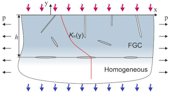 The following assumptions were used for this problem. (1) The uncoupled, quasi-static thermo-elasticity theory was applied, i.e., that the temperature distribution is independent of the mechanical field. (2) The thermal and mechanical properties of an FGC are continuous functions of the thickness coordinate y. (3) The non-homogeneity of the functionally graded material is revealed in the form of the corresponding inhomogeneous stress distributions on the surfaces of cracks [17,24,25]. These assumptions were also used in our previous works (e.g., see [19,20,21,22,23]).