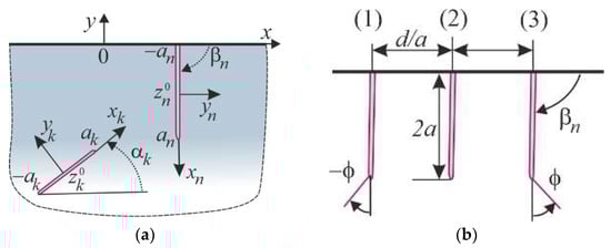 Pre-existing systems of cracks (length 2ak) in the FGCs were considered. A global coordinate system (x, y) with the x-axis lying on the FGC’s surface was introduced, and the local coordinates (xk, yk) refer to each crack, with the xk-axis on the crack lines, as shown in Figure 2a. The position of cracks was determined explicitly by their midpoint coordinates (xk0, yk0) (or in the complex form zk0 = xk0 + iyk0, where i is the imaginary unit) and the inclination angles αk to the x-axis, or βk for edge cracks (βk = –αk), see Figure 2a.