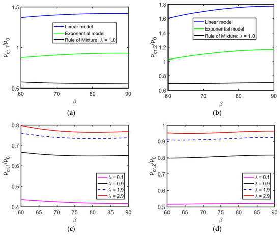 Critical loads as a function of β: (a,b) for three FG models; (c,d) for the rule of mixtures for different values of λ (0.1, 0.9, 1.9, and 2.9); (a,c) for crack 1 and (b,d) for middle crack 2.