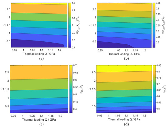 Figure 4 depicts the effect of the thermal load Q on the energy release rate (ERR) (Figure 4a,b) and critical loads pcr/p0 (Figure 4c,d) for a wide range of grading parameter λ values (from 0.1 to 3.0) in the rule of mixtures model. The results are presented for crack 1 (Figure 4a,c) and middle crack 2 (Figure 4a,c); the cracks were inclined on 90° to the surface. The parameter ranges of thermal loading Q corresponded to a temperature change ΔT (°C) from 300° to 400°.