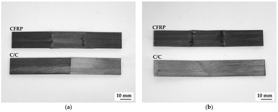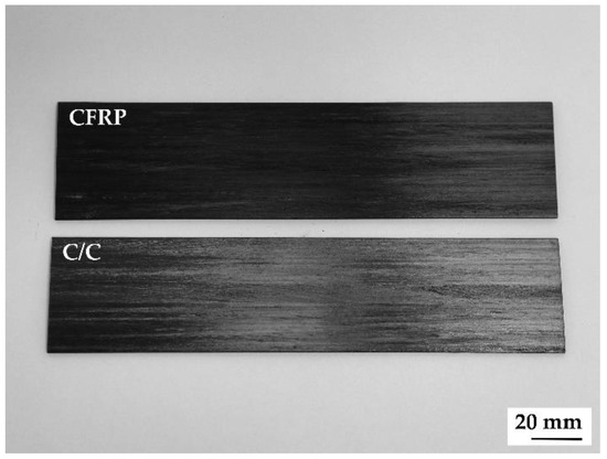 Four-point bending tests were performed following the DIN EN ISO 14125 (2011) standard to characterize the mechanical properties of the CFRP and C/C composites. In each case, eight specimens with the dimension of 100 mm × 15 mm × 2 mm were used. A Zwick/Roell Z5.0 standard testing machine (ZwickRoell GmbH & Co. KG, Ulm, Germany) with a load cell of 5 kN was used to conduct the four-point bending tests. The radius of the supports and the central loading members were 2 mm. The support width was 81 mm, and the inner span width was 27 mm. The test speed was 5 mm/min. The flexural modulus was determined as secant modulus within the strain ranges from 0.05 to 0.25% and from 0.05 to 0.13% for the CFRP and C/C composites, respectively.