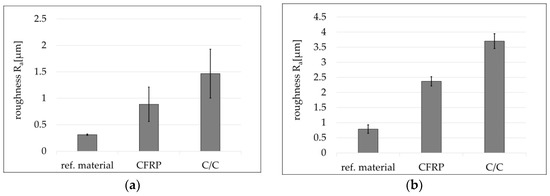 Figure 5 presents the results of the roughness measurement along the pull-off direction (0°—longitudinal to the fiber direction) as well as vertical to it (90°—transversal to the fiber direction). In addition to the CFRP and C/C specimens, a reference value (glass fiber-reinforced epoxy from the same tool) is also shown for comparison purposes. The higher roughness in the CFRP composite is due to the use of phenolic resin, and the higher roughness in the C/C composite is due to the subsequent pyrolysis. Independent of the test direction, increases in roughness of approx. 56–65% were determined due to the pyrolysis step.