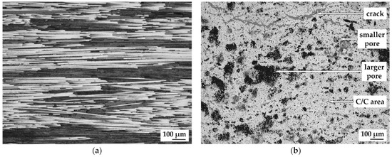 23], the maximum temperature of the pyrolysis was limited. After carbonization, however, most of the fission products have been split off, which leads to the formation and enlargement of the shown pores and cracks, as well as the macroscopic shrinkage in width and thickness. The conversion of the polymer matrix to carbon results in an increase in density and large shrinkage. Therefore, the dimensions of the sample are reduced by that shrinkage. This is also the explanation as to why the apparent porosity (ratio of the total volume of the open pores to its bulk volume) decreases, because the UD-orientated fiber structure does not prevent shrinkage in the thickness and width direction.